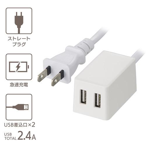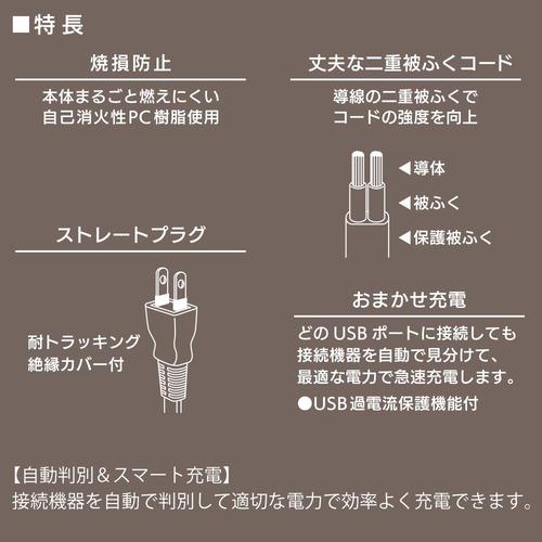 ( 特 長 )● USB充電ポート×2ポート搭載、合計出力2.4A● 急速充電対応● 接続機器を自動で判別して適切な電力で効率よく充電● USB過電流保護機能付き● 本体まるごと燃えにくい自己消火性PC樹脂活用● 導線の二重被ふくでコードの強度を向上● 耐トラッキング絶縁カバー付き● 本体カラーはホワイト( 仕 様 )● 定格入力:AC100V 50/60Hz 28VA● 定格出力:DC5V 合計2.4A● USB:Aタイプ● USBポート:2個口● プラグ形状:ストレートプラグ● コード長:2m● 対応機種:本機はUSB充電に対応したスマートフォン、タブレット、モバイルバッテリーなどに使用できます(ご注意)・USBケーブルは付属しておりません。