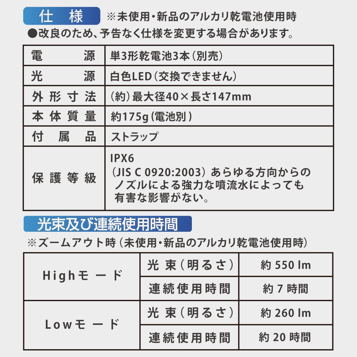 ・ ≪Highモード≫光束(明るさ)…約550 lm、連続使用時間…約7時間