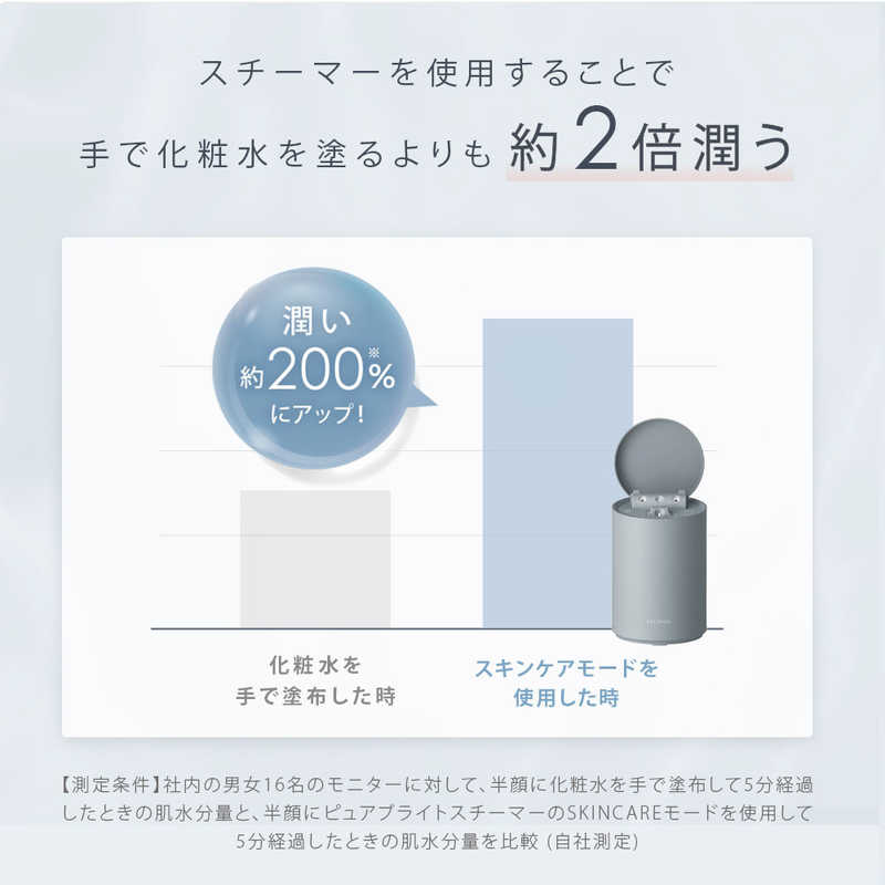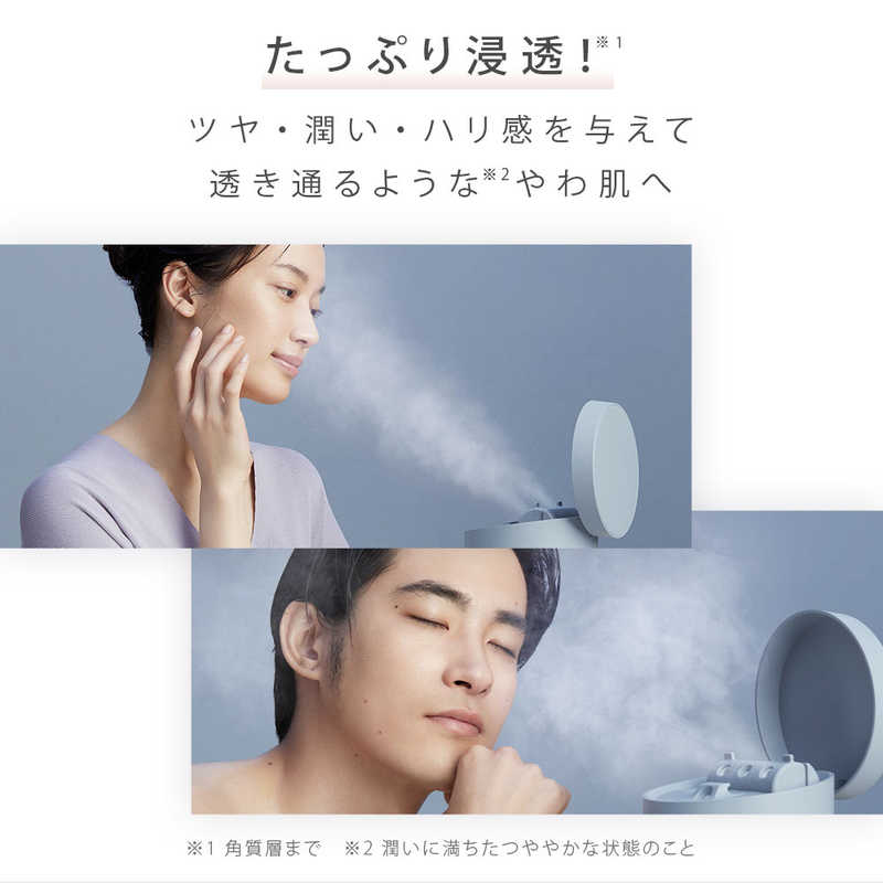 お手持ちの化粧水をミスト化し、広く顔全体を包み込むように保湿します