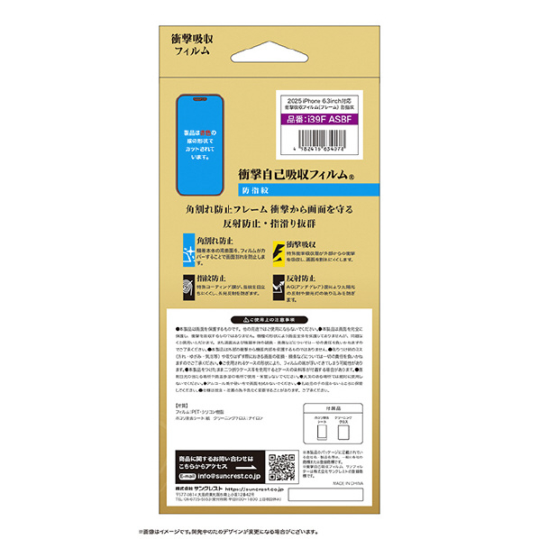 サンクレスト SUNCREST iPhone17/17 Pro/16 Pro用衝撃吸収フィルム さらさら防指紋 I39FASBF