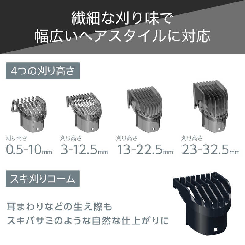 ●手元のダイヤルを回すだけで0.5mmずつ長さ調節が可能。選べる4種類のアタッチメントと組み合わせて、刈り高さ幅0.5mm~32.5mmに対応。繊細なカットにもトライでき、こだわりの仕上がりを実現します。