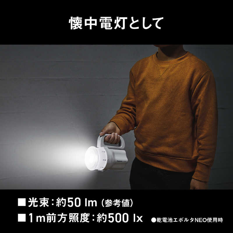 ・懐中電灯使用時:約500 lx(1m前方電池初期値(乾電池EVOLTA NEO単1形使用時))