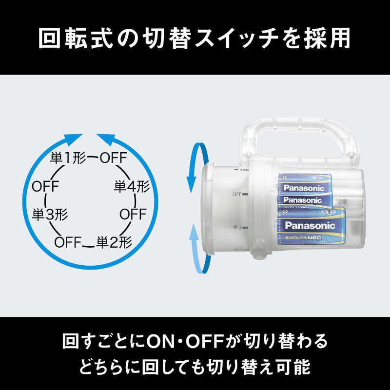※乾電池エボルタNEOを単1形~単4形まで全サイズ使用時の合計時間。連続使用時は、各サイズのスイッチの切り替え操作が必要です。
