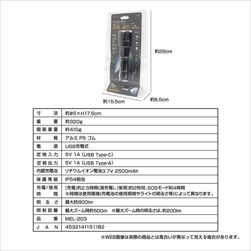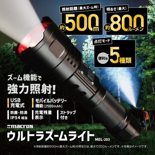 マクロス ウルトラズームライト ズーム機能搭載 最大約800ルーメン ブラック MEL203