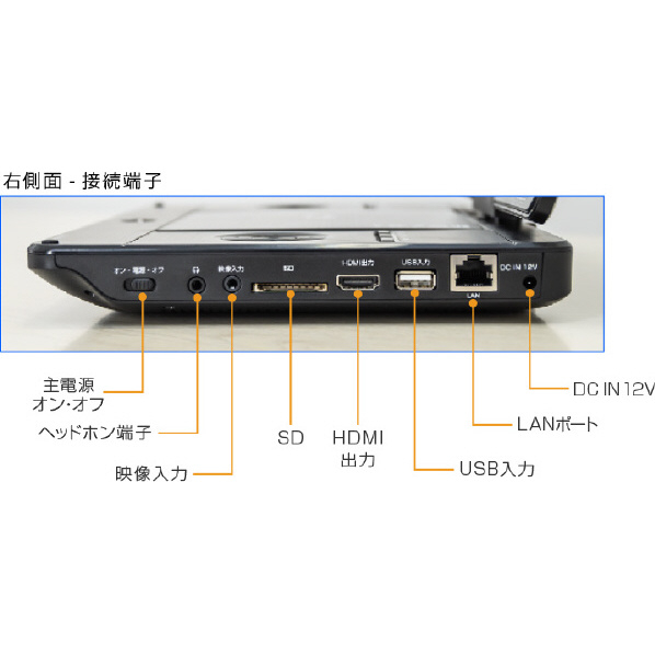 ●搭載端子:USBポート×1、 SDカードスロット×1、 3.5ヘッドホン出力端子×1、映像入力端子×1、HDMI出力端子×1、LANポート×1、電源入力端子×1