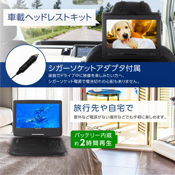 ●車内で楽しめるヘッドレスト取り付けキット&シガーソケットアダプタ付属。