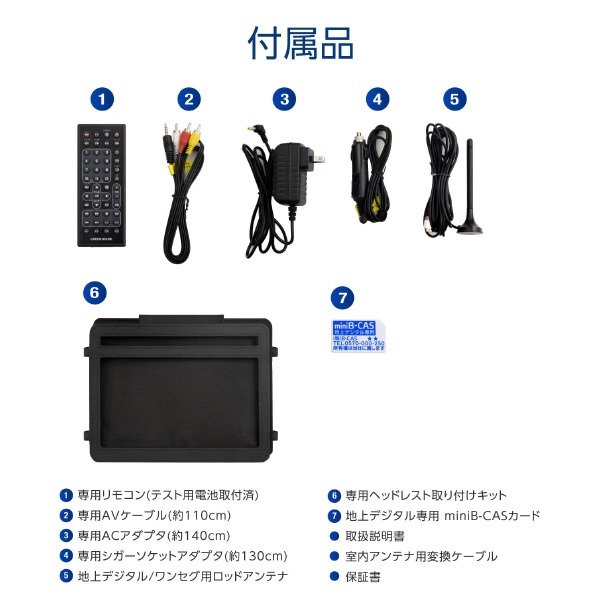 ●付属品:専用リモコン(テスト用電池取付済)、専用AVケーブル(約110cm)、専用ACアダプタ(約140cm)、専用シガーソケットアダプタ(約130cm)、専用ヘッドレスト取り付けキット、地上デジタル/ワンセグ用ロッドアンテナ、地上デジタル専用 miniB-CASカード、取扱説明書、保証書