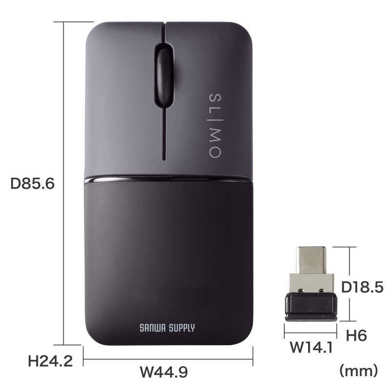 ●寸法:マウス/約W4.49×H2.42×D8.56cm、レシーバー/約W1.41×H0.6×D1.85cm