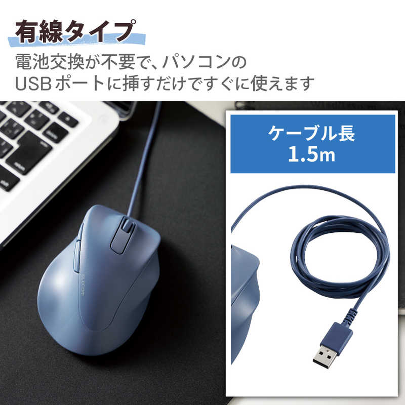 電池交換が不要で、パソコンのUSBポートにケーブルを差すだけですぐに使える有線接続タイプです。