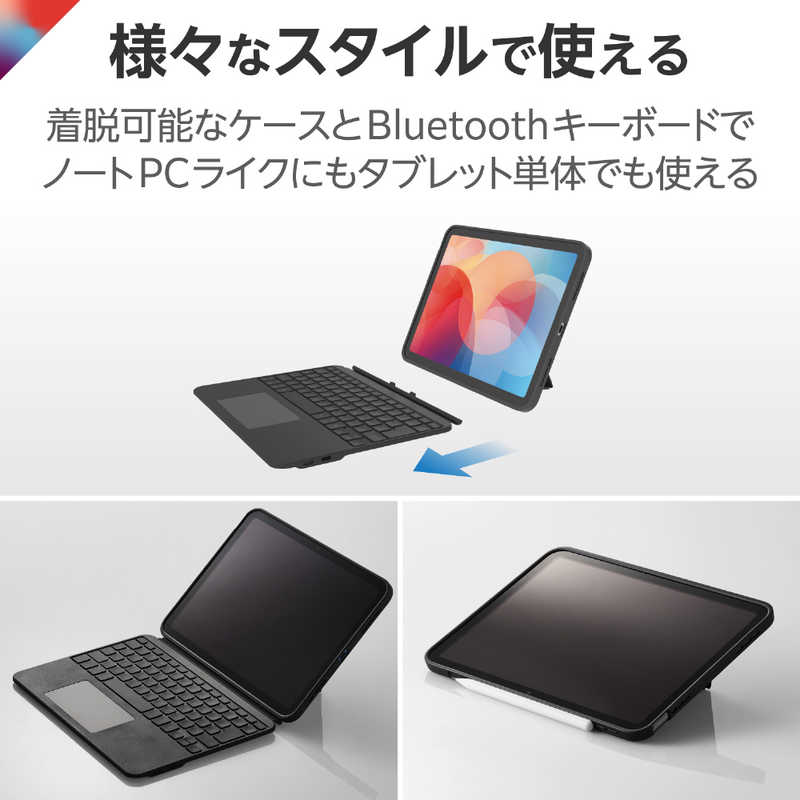 着脱可能なBluetooth®キーボードで、ケース単体でもタブレットカバーやスタンドとして利用可能です。
