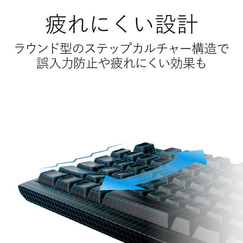 ●前後方向のキー誤入力を防止する、階段状のキー配列やキートップ全体がラウンドしている、ステップスカルプチャー構造です。