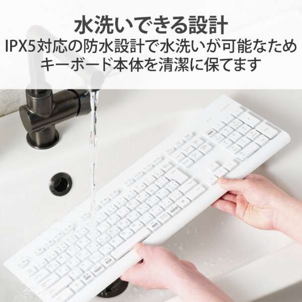 ●IPX5対応の防水設計で水洗いが可能なため、キーボード本体を清潔に保てます。