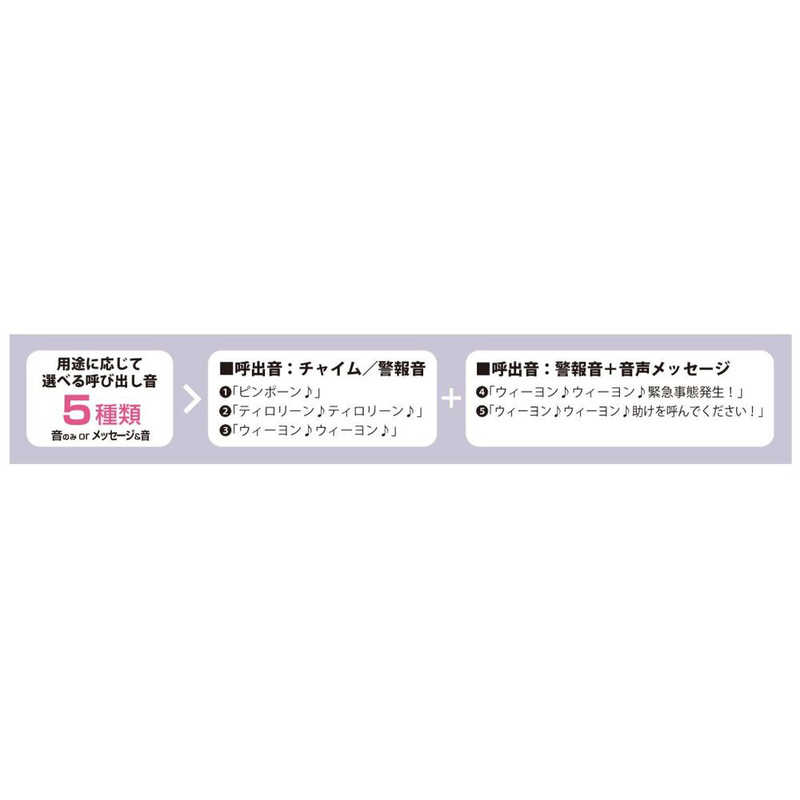 呼び出し音が5種類、警報音と音声メッセージの選択ができ、用途に応じ選べ、セキュリティ対策にも最適です。