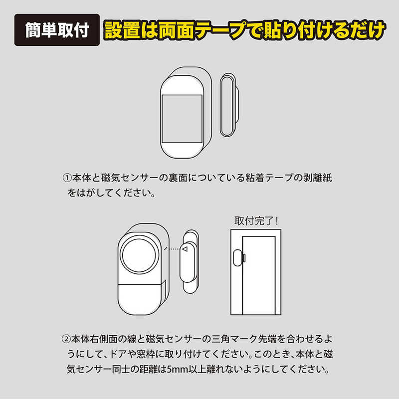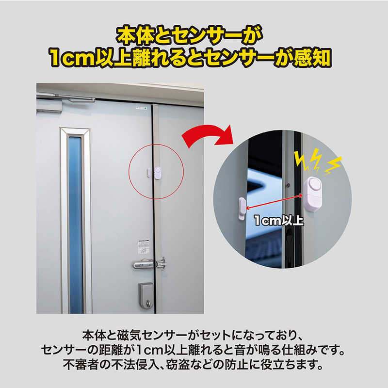 本体と磁気センサーがセットになっており、センサーの距離が1cm以上離れると音が鳴る仕組みです。