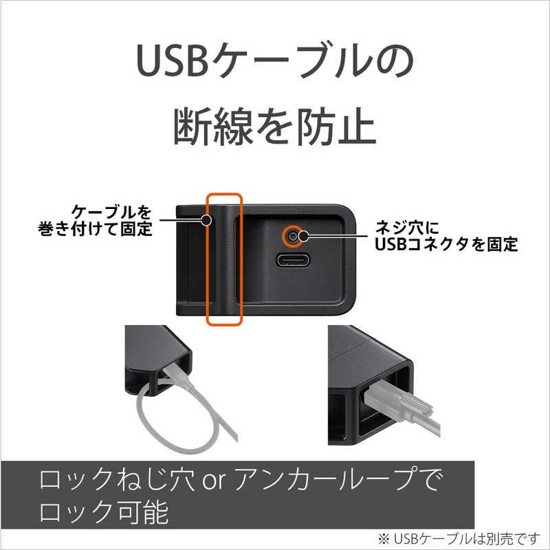●安全性と信頼性(USBケーブル固定と電源ランプ)。