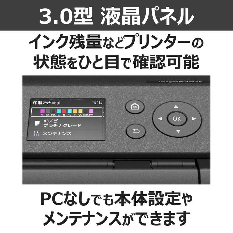 ・インク残量などプリンターの状態をひと目で確認可能。また、PCなしでも液晶パネルを見ながら本体設定やメンテナンスができます。