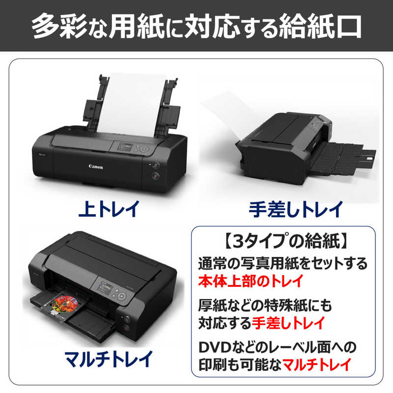 ・メディア特性に合った3タイプの給紙口により、多彩なメディアに対応。通常の写真用紙をセットする本体上部のトレイに加え、厚紙などの特殊紙にも対応する手差しトレイを設置。さらにマルチトレイを利用すればDVDなどのレーベル面への印刷も可能です。