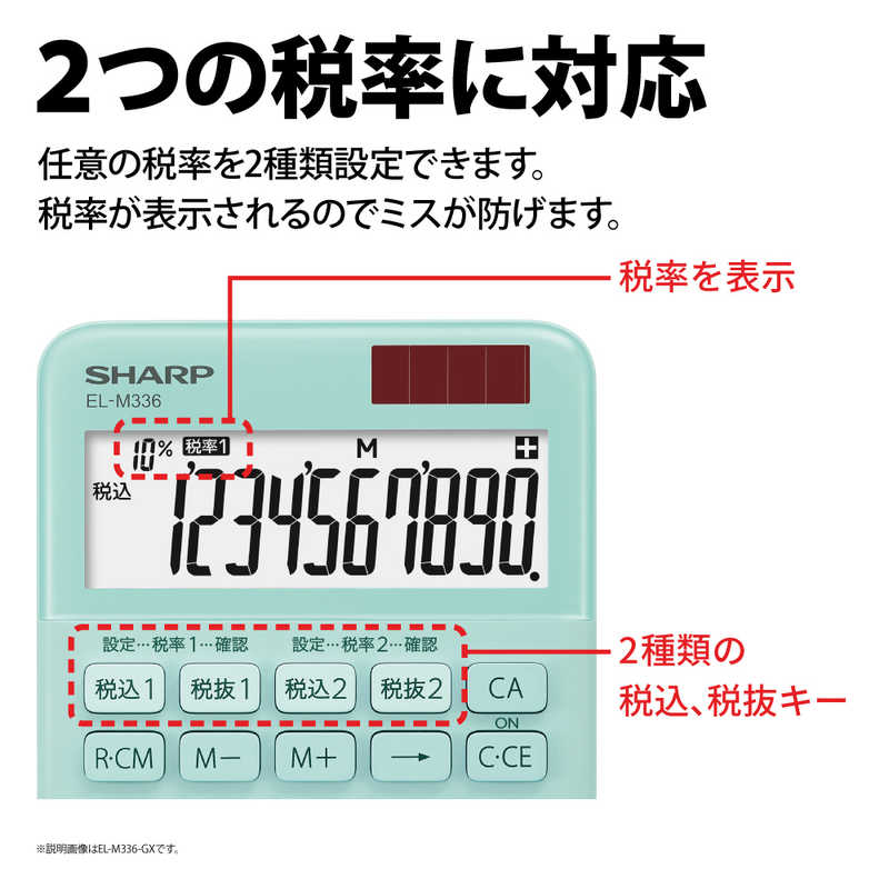 ●「税計算」「演算状態表示」「早打ち」などのビジネスでも使える計算機能を搭載。通常税率の他、軽減税率またはサービス料など任意の税率を2種類設定できます。計算の際には税率が表示されミスが防げます。