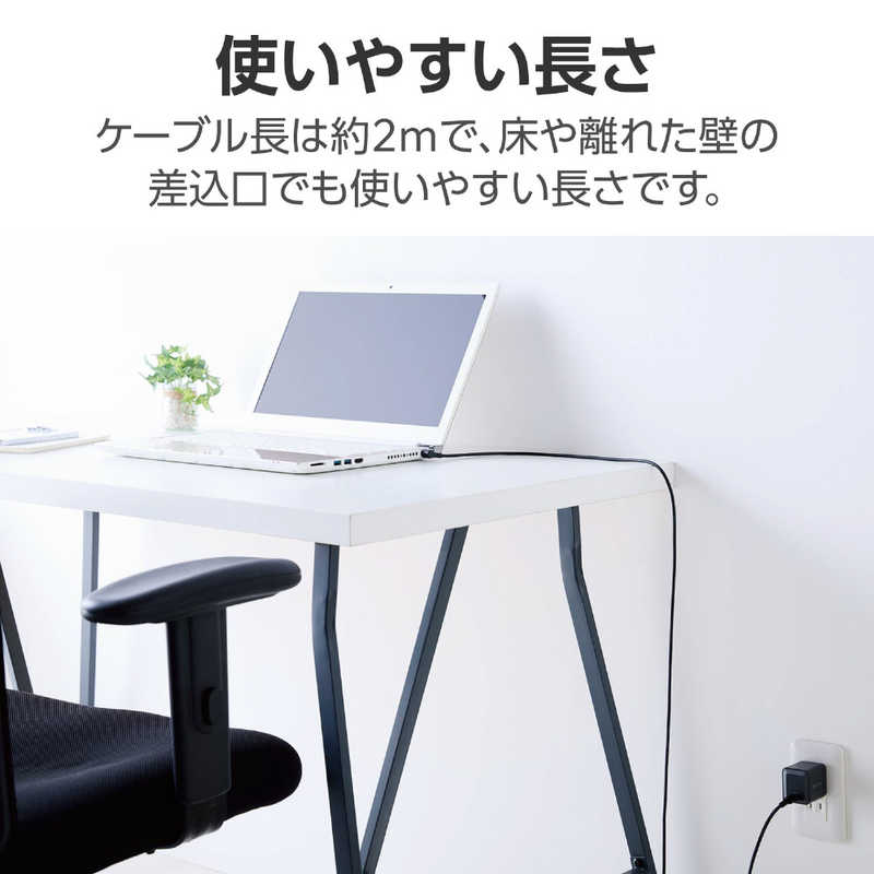 ●ケーブル長は約2mで、床や離れた壁の差込口でも使いやすい長さです。