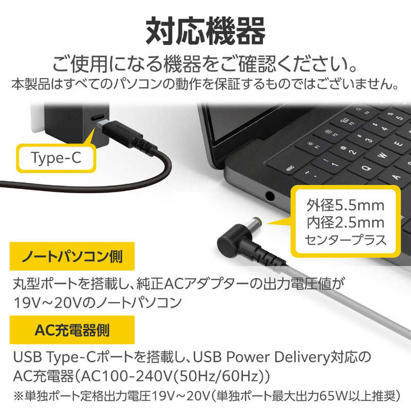 ●対応機器:[ノートパソコン側]丸型ポートを搭載し、純正ACアダプターの出力電圧値が20Vのノートパソコン、[AC充電器側]USB Type-Cポートを搭載し、USB Power Delivery対応のAC充電器(AC100-240V(50Hz/60Hz)) ※単独ポート最大出力65W以上推奨