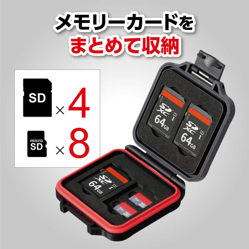 ●SDカード4枚とmicroSDカード8枚を収納。ABS樹脂製ケースと内側のクッション材が外部からの圧力や衝撃からメモリーカードを保護します。