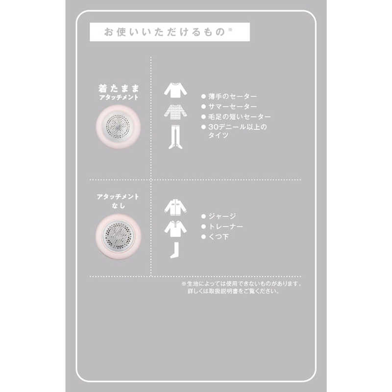 ●気付いたときに服を着たまま毛玉を取れる、着たままアタッチメントを付属しています。薄手・毛足の短いセーター、30デニール以上のタイツなど、その場でお手入れできます。