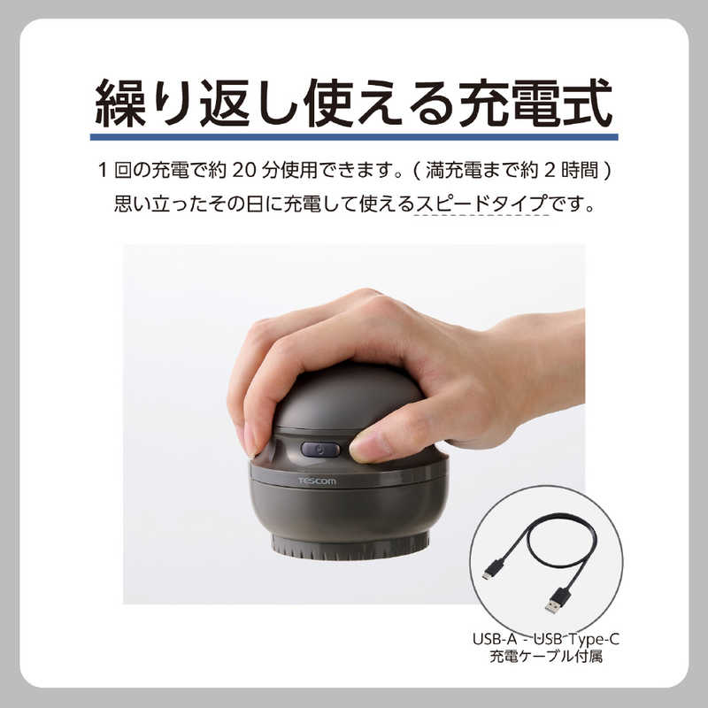 ●繰り返し使える充電式。1回の充電で約20分使用できます。満充電まで約2時間なので、思い立ったその日に充電して使えるスピードタイプです。