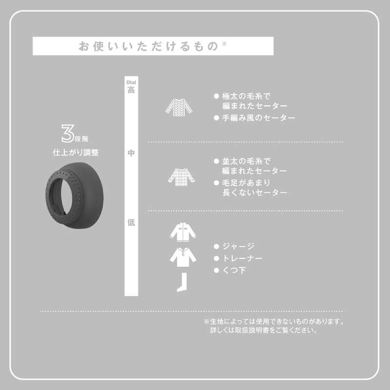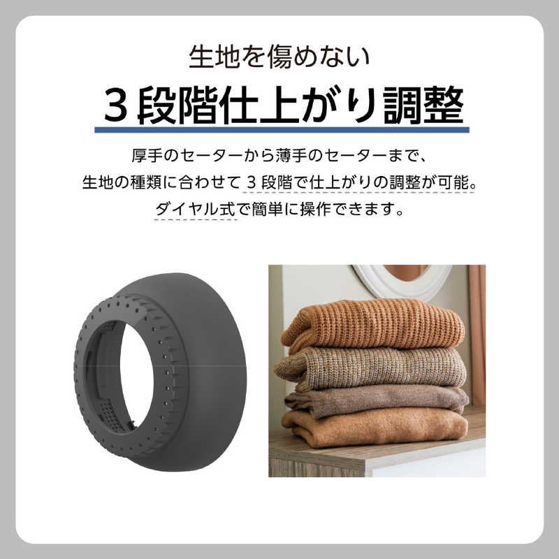 ●厚手のセーターから薄手のセーターまで、生地の種類に合わせて3段階で仕上がりの調整が可能。ダイヤル式で簡単に操作できます。