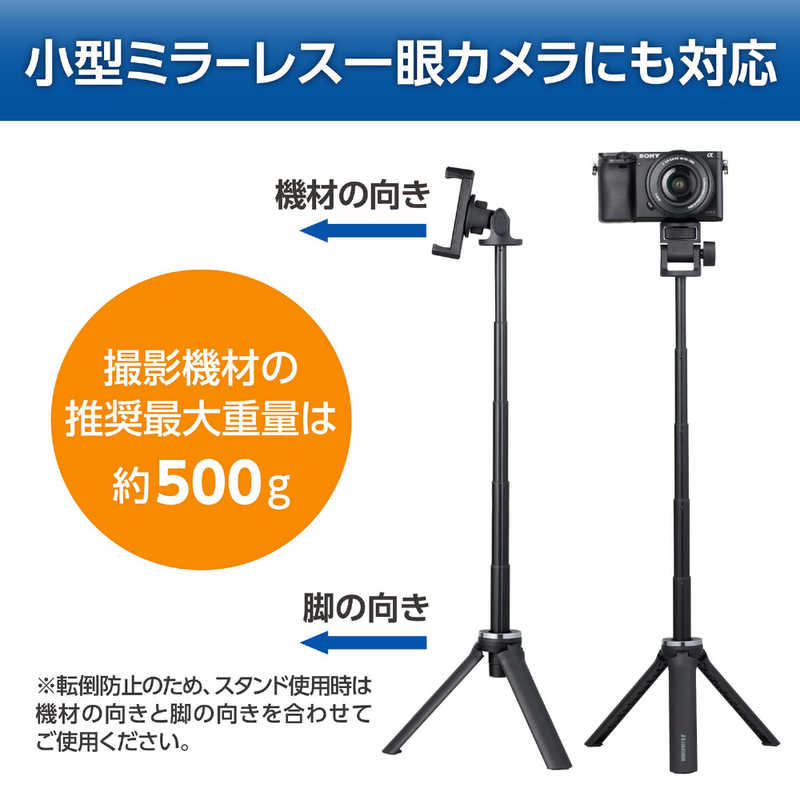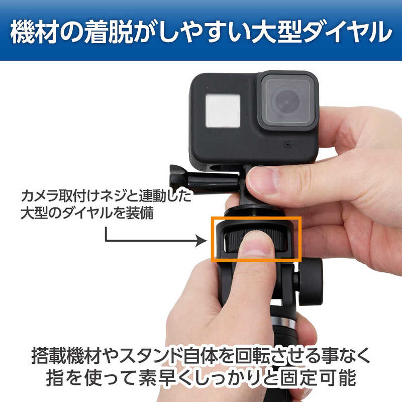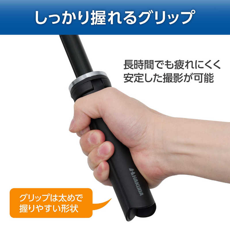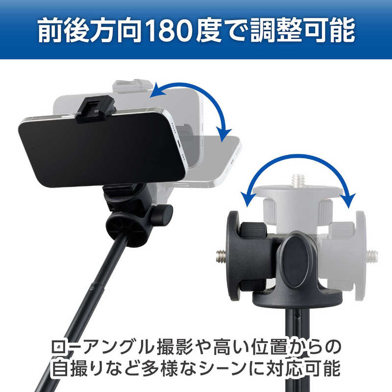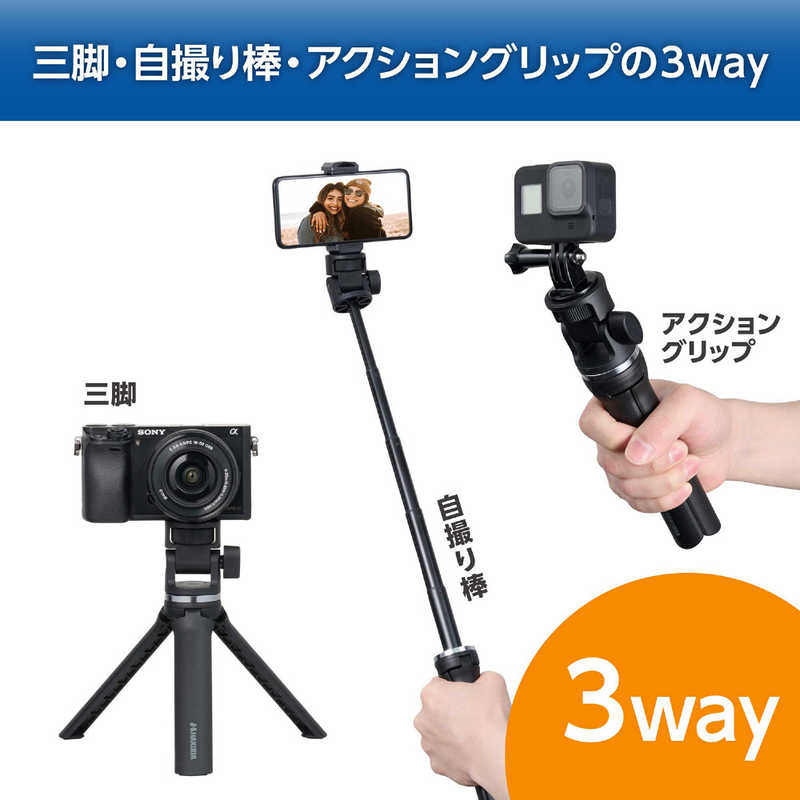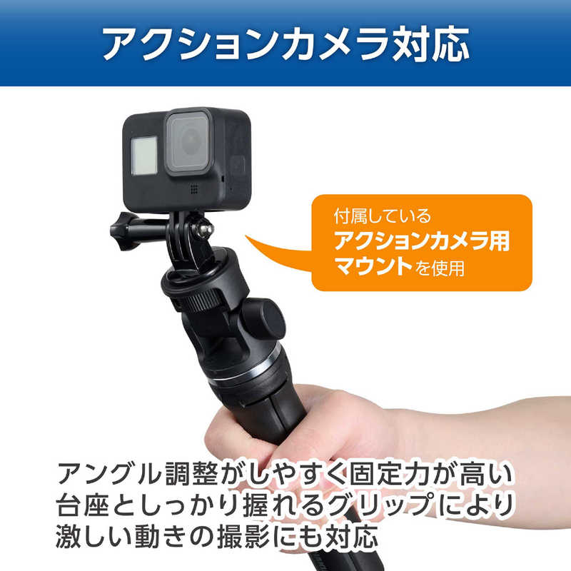 ■脚をたたんで自撮り棒やグリップとしても使え、アクセサリーシューを備えたスマートフォンホルダーと、アクションカメラ用マウントが付属しています。多機種に対応し、自撮りやライブ配信、動画撮影の幅が広がる便利なアイテムです。