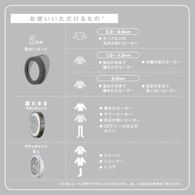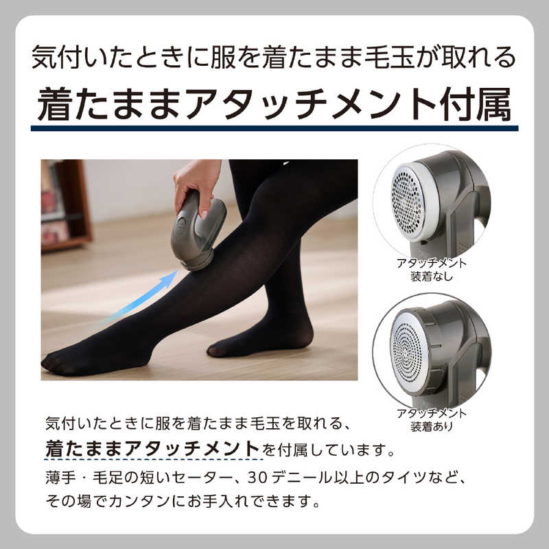 ●気付いたときに服を着たまま毛玉を取れる、着たままアタッチメントを付属しています。薄手・毛足の短いセーター、30デニール以上のタイツなど、その場でカンタンにお手入れできます。