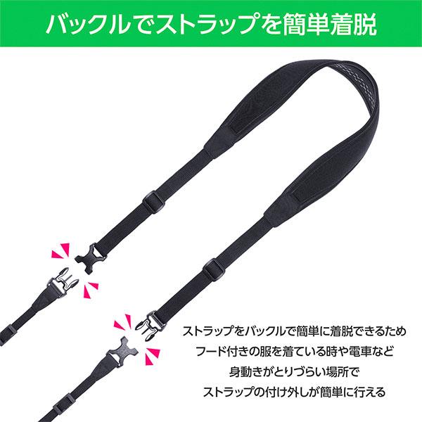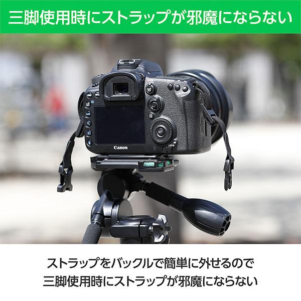 ストラップをバックルで簡単に外せるので、三脚使用時にストラップが邪魔になりません。