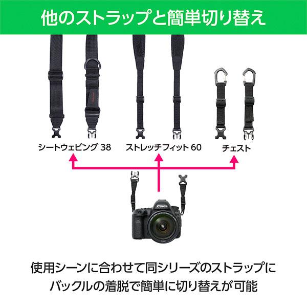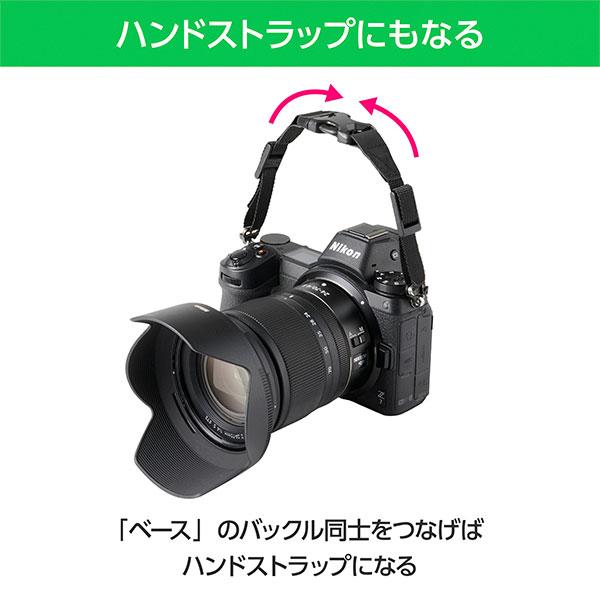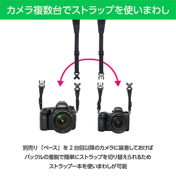カメラを複数台持ち運ぶ際に、別売りの「ベース」を2台目以降のカメラに装着しておけば、バックルの着脱で簡単にストラップを切り替えられるため、ストラップ1本を使いまわしが可能。