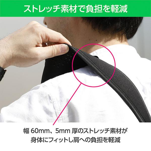幅60mm、5mm厚のストレッチ素材が身体にフィットし、肩への負担を軽減します。