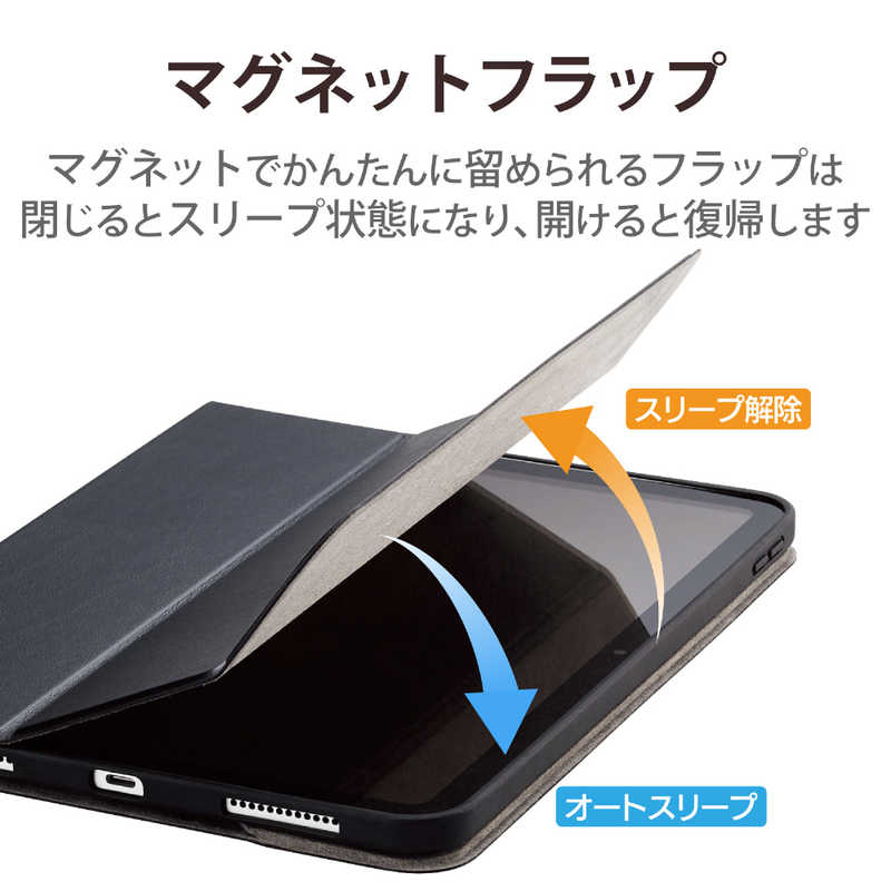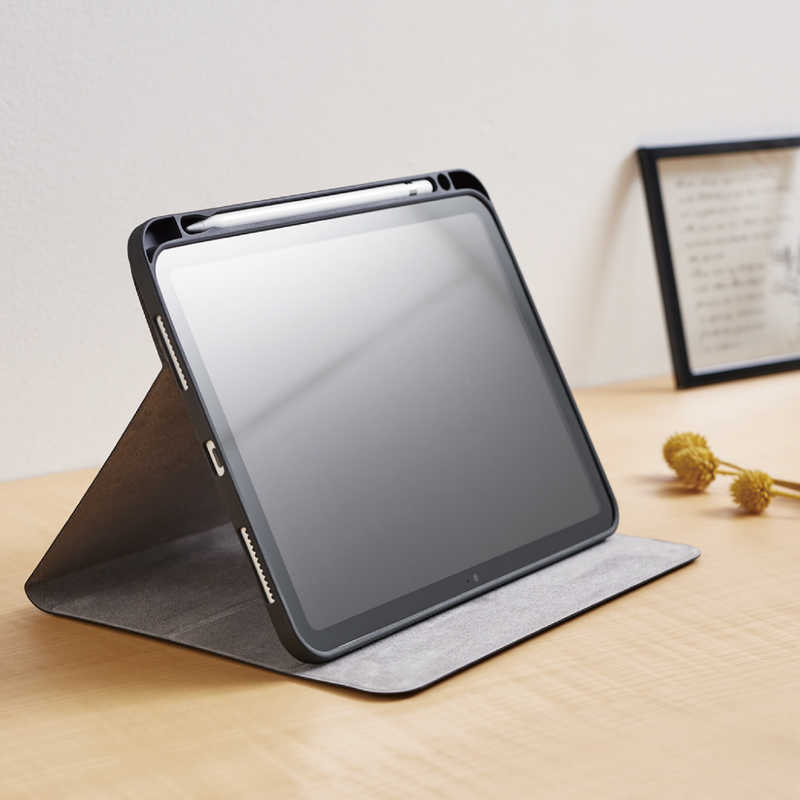 弾力性のあるTPU素材が傷と衝撃から守るiPad 第10世代(2022年モデル)用フラップケースです。360度回転でき、縦向き、横向きのお好きな角度で使用できます。