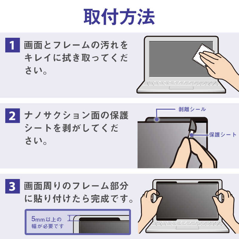 ■仕様1: [寸法]幅316mm×高さ188mm(左右上下100×5mmのナノサクション部含む)[フィルター厚み]フィルター部:0.37mm、ナノサクション部:1.05mm[表面硬度]2H[静電気防止機能]×[取付方法]ナノサクション採用フレームが画面へ吸着[材質]フィルター:PET、ナノサクション部:アクリル、カバー部:シリコンラバー