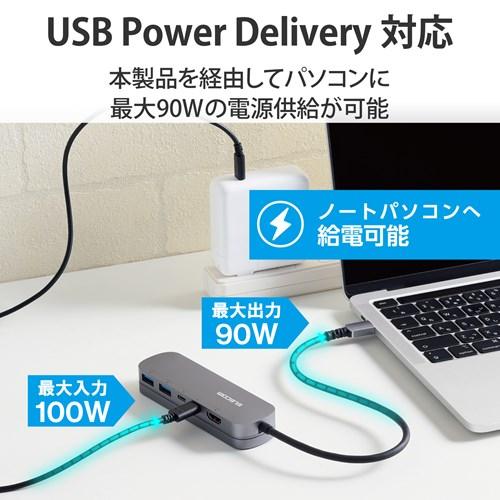 、USB Power Delivery対応(最大入力100W / 最大出力90W)、DisplayPort(TM) Alt mode (USB2.0接続時は、USB2.0互換で動作(USB2.0時は、映像出力非対応))