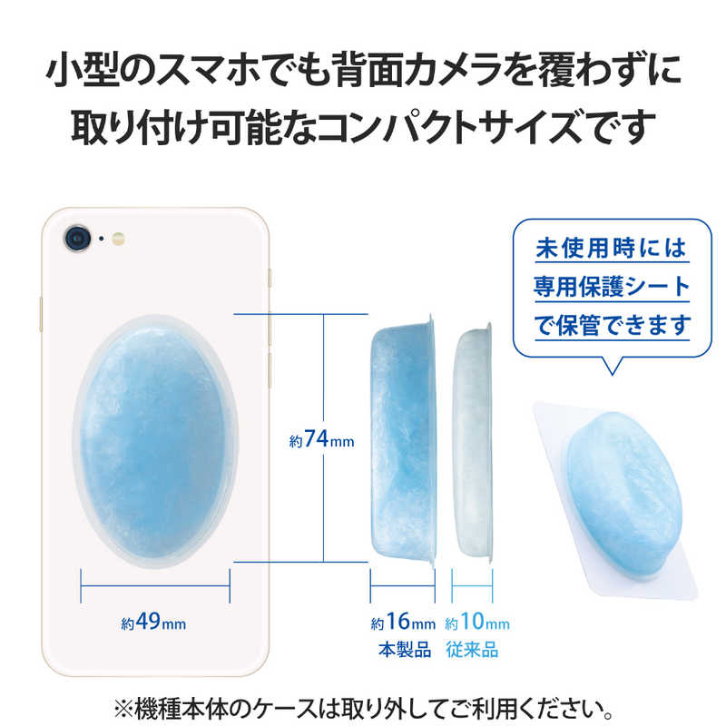 ●W約49mm×H約74mmで、小型のスマートフォンでも背面カメラを覆わずに貼り付けできるコンパクトサイズです。