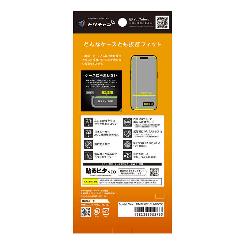 トリニティ iPhone17/16Pro用ケースとの相性抜群のぞき見防止画面保護強化ガラス光沢 TR-IP25M2-GLS-LPVCC