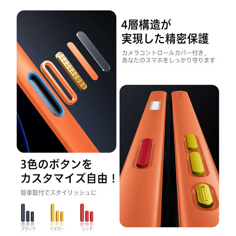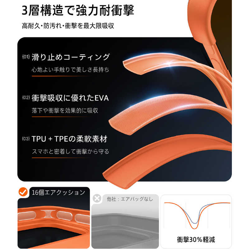 ・360°衝撃を吸収できるエアクッションのデザインのため、衝撃を受けやすい4隅から全方向にスマホとカメラをしっかり保護できます。