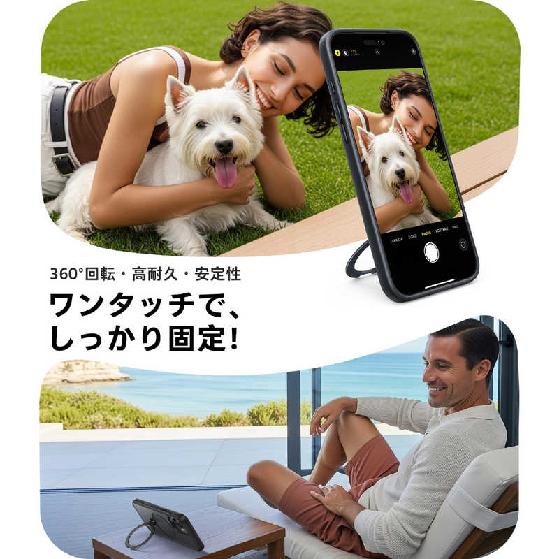 ・横置き15~150°、縦置き30~90°安定して立てられ、撮影や会議、ビデオ通話などに最適。