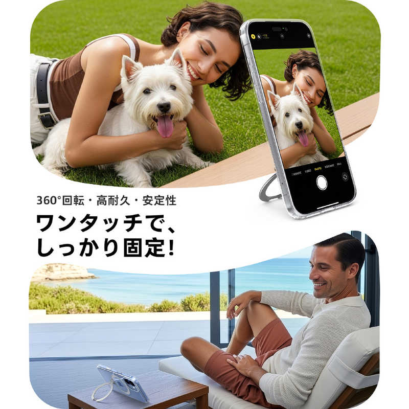 ・四象限ゼンマイ式スタンドを搭載し、360°自由回転と多方向調整が可能。