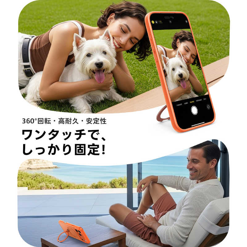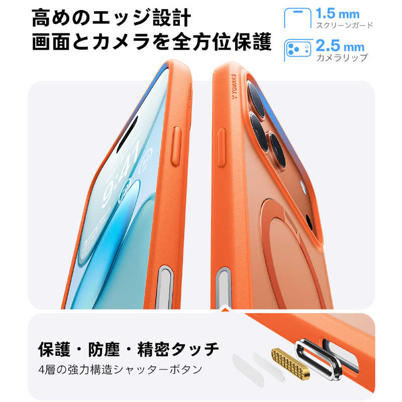 ・2023年IFデザイン賞受賞・無限回転スタンド:4象限ピボットブラケットにより、スマホを15°?85°の水平角度、0°?85°の垂直角度で支えられる(30000回以上の開閉テスト済み)・TORRAS独自のHalbach磁石技術:内蔵された38個のN52磁石により18Nの吸着力を実現し、すべてのMagSafe対応アクセサリーに対応可能・シームレスな一体型デザイン:背面に突起がなく滑らかな仕上がり・2.44m落下防止性能:フレーム部分の強化保護デザインで2倍のMIL耐衝撃性能