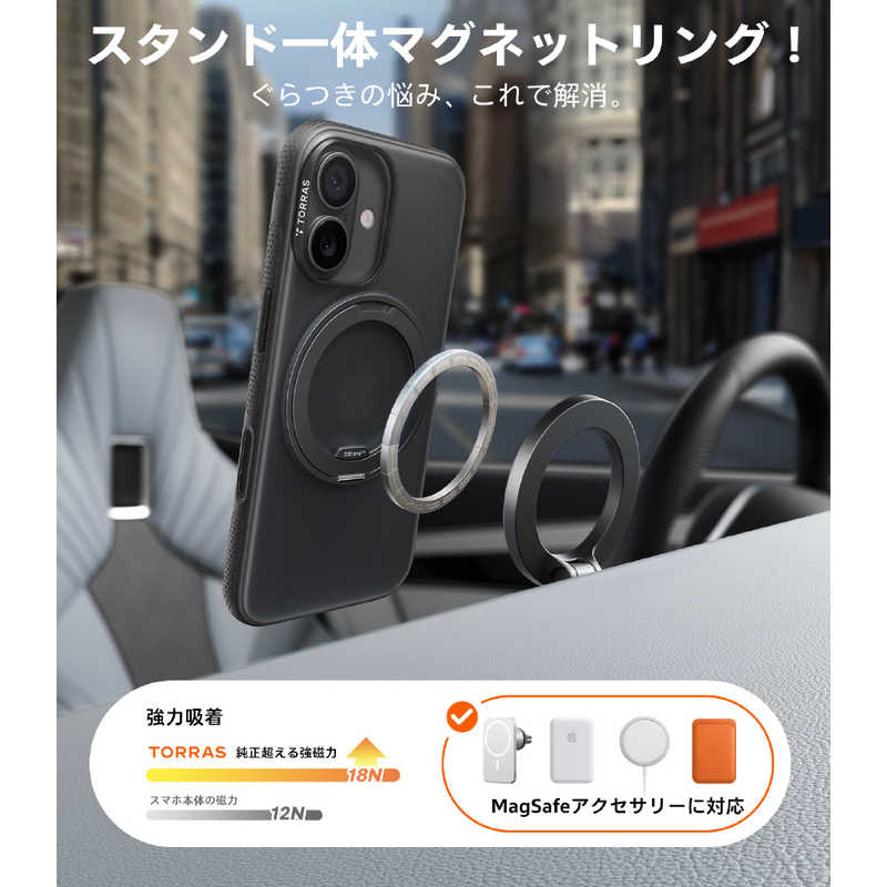 ・カメラレンズ設計の改善により視覚的な厚みを軽減しつつ、カメラの保護性を確保・TORRAS独自の「Halbach」マグネット技術により、N52マグネットブラケット38個が内蔵され、MagSafeアクセサリーにしっかり吸着します。