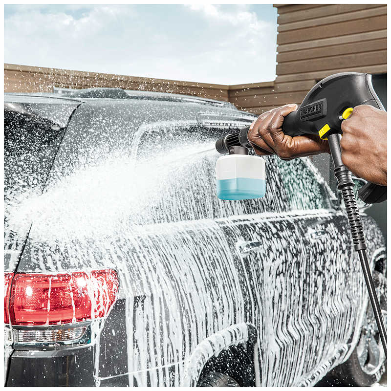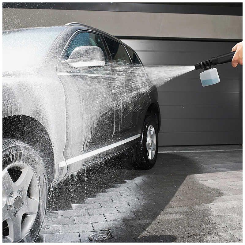 ケルヒャーの洗剤を直接タンクに注ぎ、ノズルをガンに取り付けて泡を噴射します。