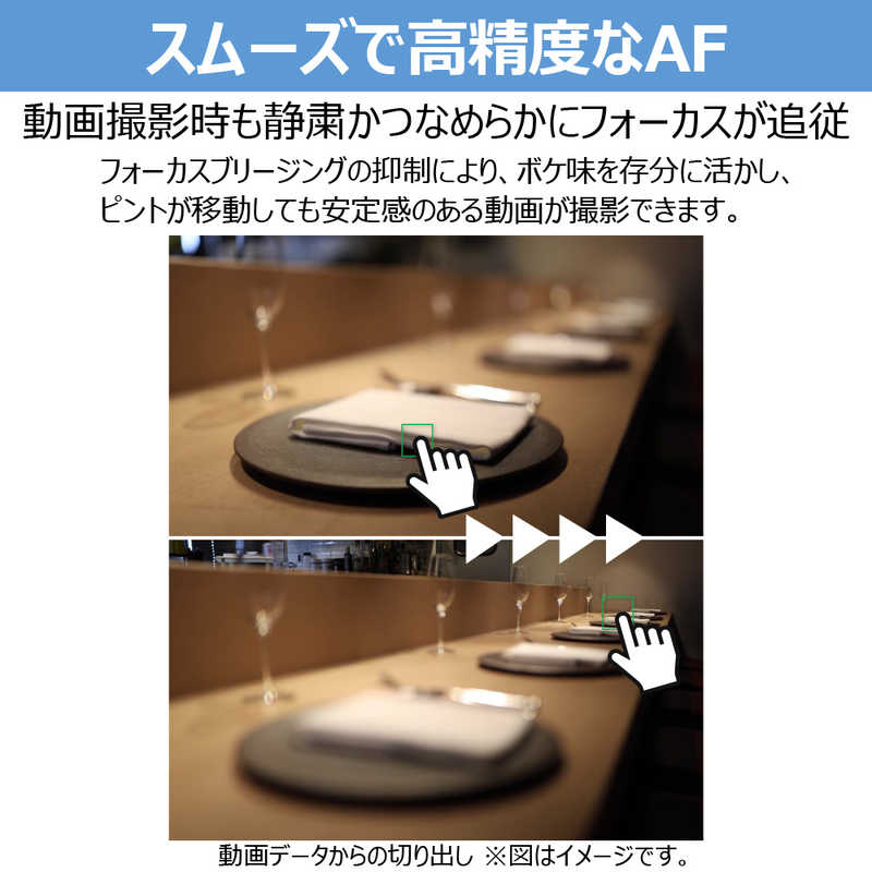 また、動画撮影時のフォーカス操作に伴い画角変動が生じる「フォーカスブリージング」を徹底的に抑制する優れた光学設計により、画角変化の少ない安定した構図での動画撮影を実現します。