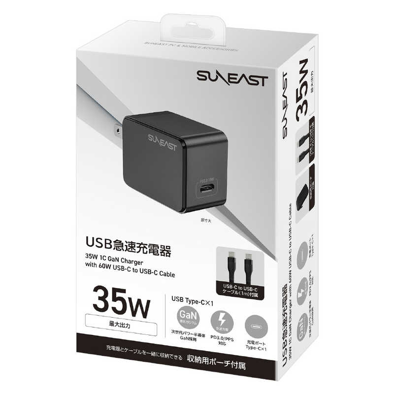 SUNEAST 急速充電器 35w USBtypeC1ポート / GaN(窒化ガリウム) 採用 シリコンケーブル1m付 小物入れポーチ付 ブラック SE-AC035C01BKF