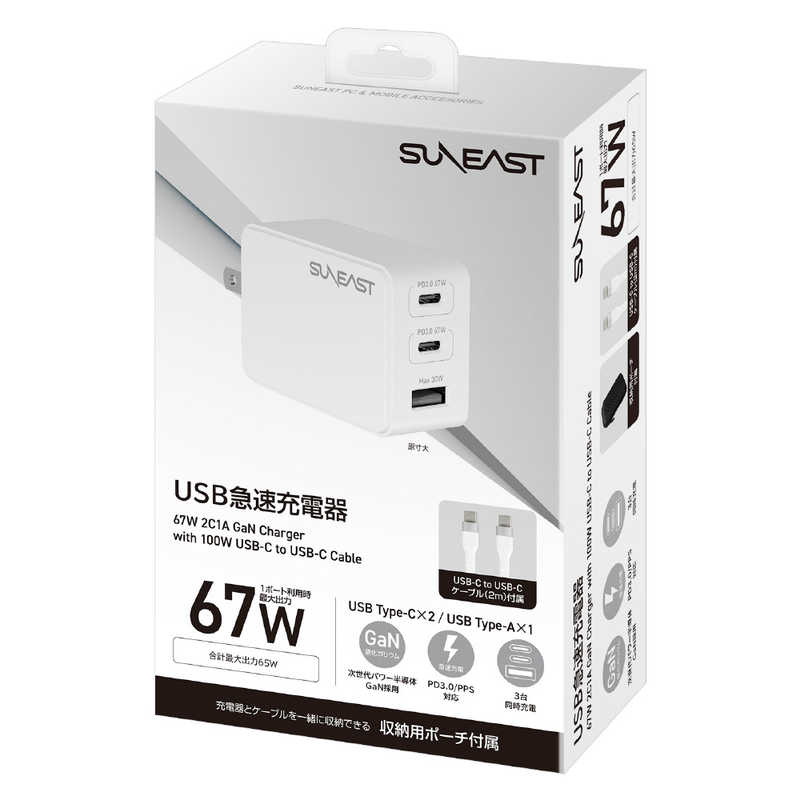 SUNEAST 急速充電器 67w USBtypeCx2ポート typeAx1ポート /GaN(窒化ガリウム) 採用 シリコンケーブル2m付 小物入れポーチ付 ホワイト SE-AC067C02WHF