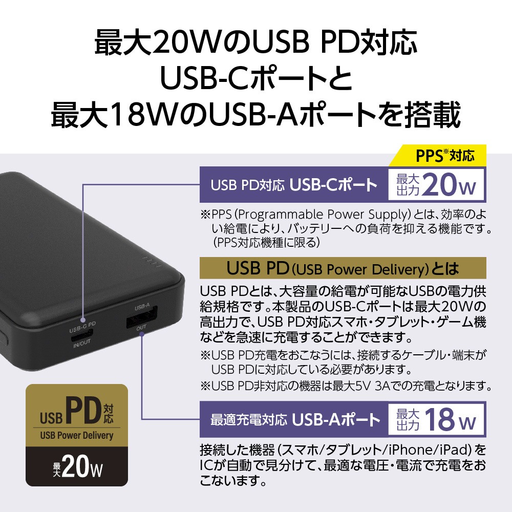 ・最大出力20WのUSB-Cポートと最大出力18WのUSB-Aポートを搭載。
