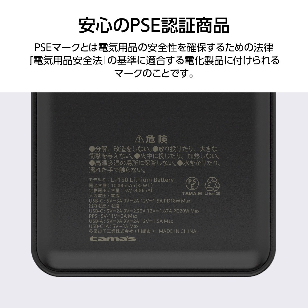 多摩電子工業 モバイルバッテリー 10000mAh PD20W対応 リン酸鉄 ブラック TLP150UCK