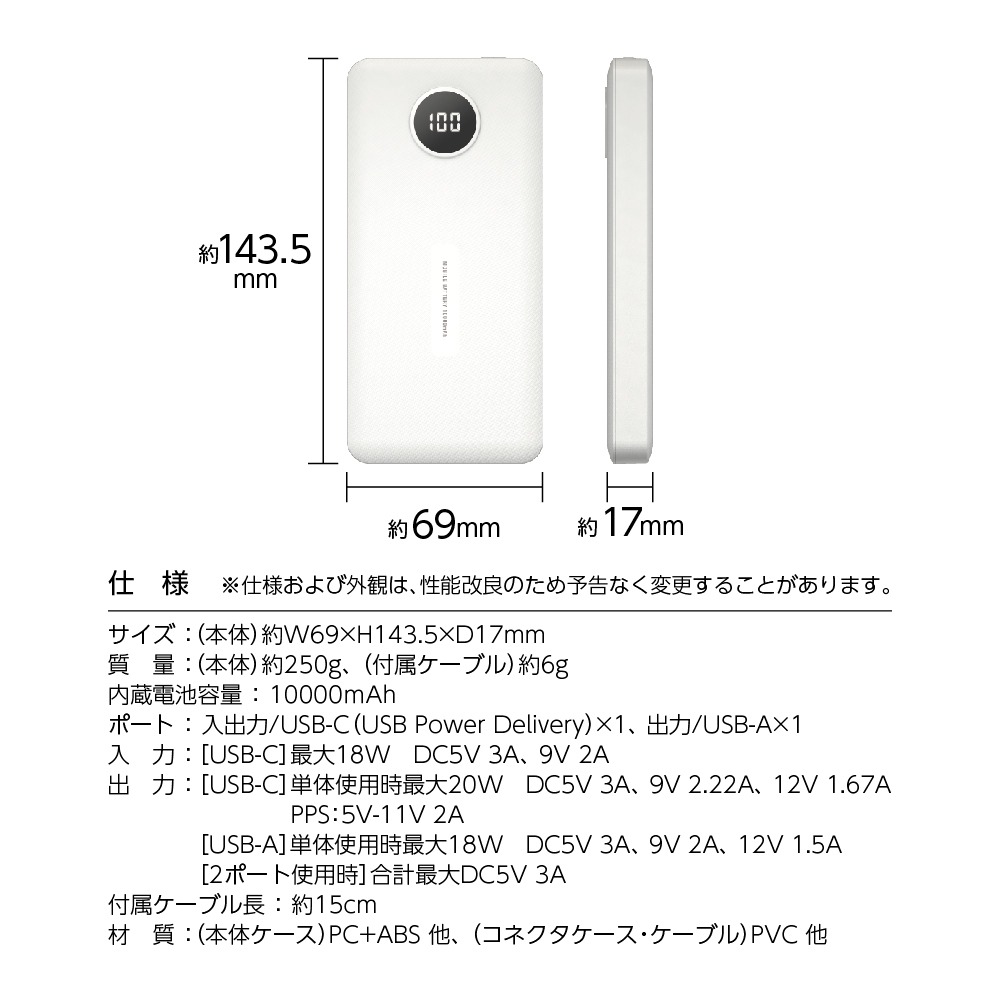 ・最大20WのUSB PD(USB Power Delivery)対応USB-Cポートと最大18WのUSB-Aポートを搭載した10000mAhモバイルバッテリーです。